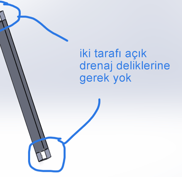 Sıcak daldırma galvaniz işleminde parçanın yalnızca tek tarafında açıklık bırakmak yeterli değildir. Malzemenin her iki ucunda da uygun açıklıklar bulunmalıdır. Çünkü parça çinko banyosuna daldırılırken bir taraftan hava tahliye edilirken, diğer taraftan eriyik çinko içeri girer. Bu akışın dengeli ve kesintisiz olması, parçanın yüzeyinin daha temiz, düzgün ve eksiksiz kaplanmasını sağlar. Aşağıda, bu prensibin uygulandığı bir imalat parçası üzerinden örnek gösterilmiştir.